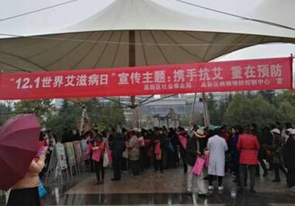 2016年是第四轮防治艾滋病人民战争开局之年,12月1日是第29个“世界艾滋病日”。为营造社会共同关注和参与艾滋病防治的浓厚氛围,结合我区艾滋病防治工作要求,2016年12月1日,昆明高新区防艾办组织管委会办公室、社会事业局、公安高新分局、住建局、总工会、团工委、妇联、工商高新分局、人力资源和社会保障局、食品药品监督管理局、文化教育体育旅游局、财政高新分局等防艾委成员单位及区疾控中心、社区卫生中心(站)、十社区居委会在高新时代广场举行了第29个“世界艾滋病日”宣传活动,拉开了高新区防治艾滋病这宣传月系列活动的序幕。