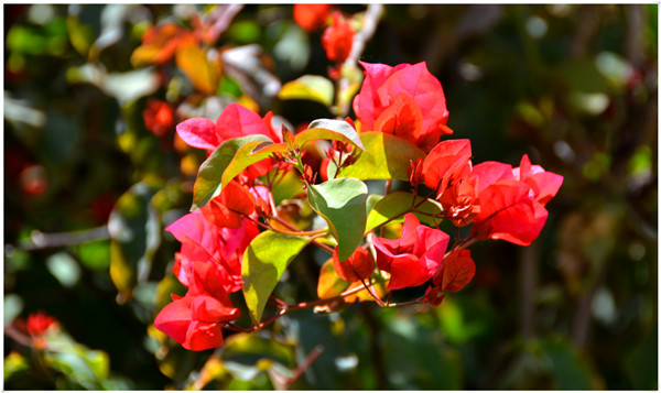 三朵聚生于三片红苞中,外围的红苞片大而美丽,被误认为是花瓣,因其形状似叶,故称其为叶子花。
