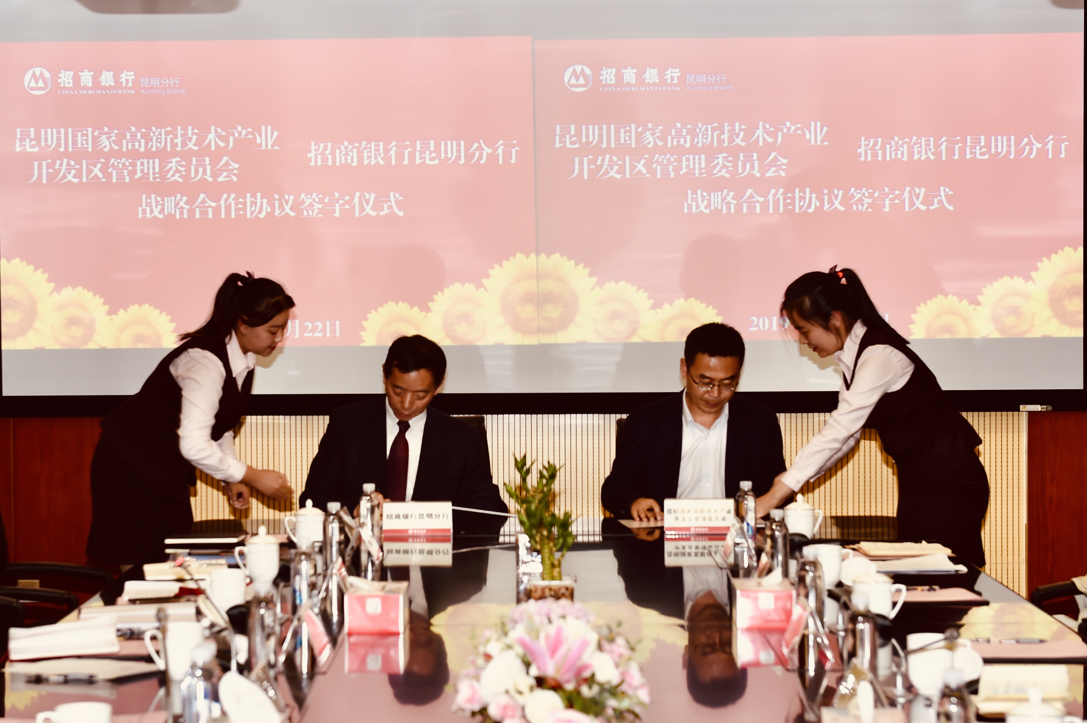 为进一步深化双方交流合作,在前期多次座谈、交流的基础上,2019年10月22日下午,高新区管委会与招商银行昆明分行共同举办了《战略合作协议》签署仪式。高新区管委会主任王迅,招商银行昆明分行行长彭才茂分别代表双方签署了《战略合作协议》。根据该协议,招商银行昆明分行将加大对高新区辖区内重点产业、重点领域、重点企业的支持力度,在政府重点项目、重大基础设施建设、社会公共及民生事业、生命科学、生物制药及大健康、稀贵金属、新材料等领域,及对区域内孵化器管理中心、高创园服务的企业提供全方位综合金融服务,配合高新区做好促进社会经济增长的各项举措,助力高新区经济发展。