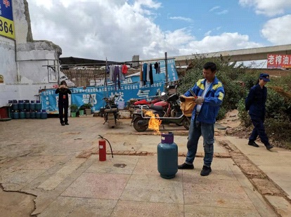 演练过程中使用着火钢瓶,灭火器、厨房的抹布作为应急灭火设施,参演人员就如何正确使用灭火器或湿毛巾扑灭初期火源等情况进行了示范演练,分别用干粉灭火器和湿毛巾将火焰扑灭,之后用冷水对钢瓶降温然后关闭角阀用肥皂水检漏。参演人员的演练动作迅速、规范、处置得当。