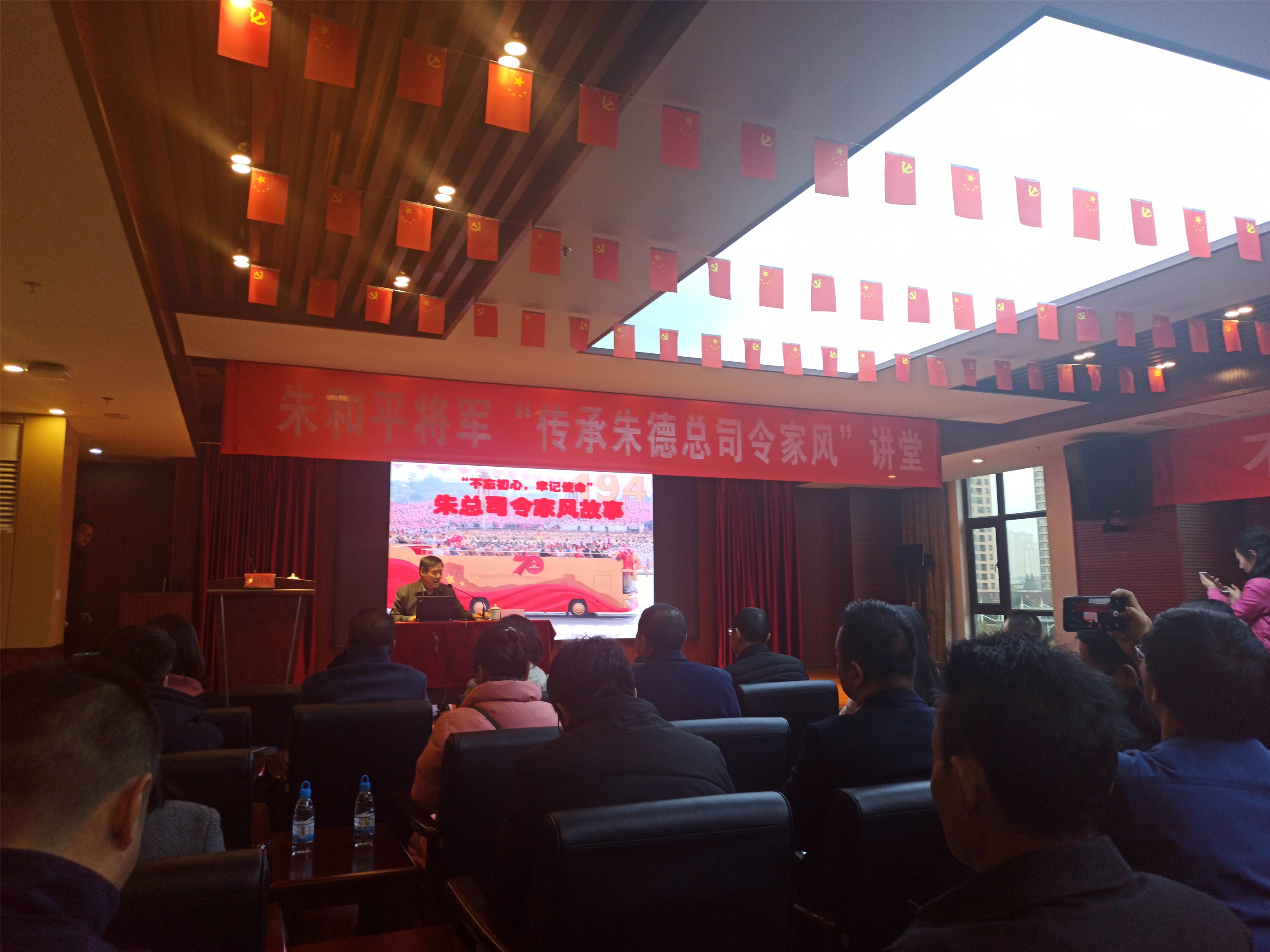 习近平总书记常提“天下之本在国,国之本在家”。在开展“不忘初心、牢记使命”主题教育中,12月5日上午,在高新火炬流动党校教学点—同丰商务中心大厦3楼会议厅,高新区非公党委联合省药品流通行业协会、南昌商会、同丰医药等党组织,在“朱德与云南陆军讲武堂及中国革命”学术研讨会之余,邀请开国元勋朱德总司令嫡孙、空军指挥学院原副院长、中国预警与电子战专家朱和平将军,为园区非公企业党员、以及入驻同丰中心单位党员职工、协会商会党员,举办了一场“传承朱德总司令家风讲堂”专题讲座。